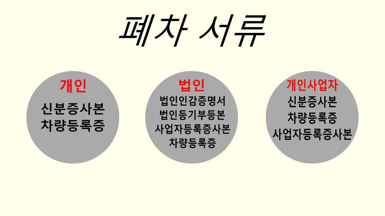 차량 명의가 개인인지 법인인지, 혹은 상속 상황인지에 따라 서류가 달라집니다. 일반적으로 개인 명의라면 자동차 등록증과 신분증 사본이 필요하고, 법인 차량은 법인 인감증명서, 상속 차량은 가족관계증명서와 상속인 인감 등이 추가됩니다. 광주폐차장에서는 접수 전 상담을 통해 필요한 서류를 미리 알려주므로, 차주는 준비 과정에서 불필요한 혼란을 줄일 수 있습니다.